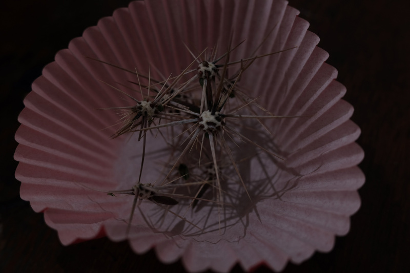Zhang Ruyi’s interest in transparency as a mean of differentiation reaches its greatest expression in her 2020 piece Speaking Softly – 2. A large, translucent, plastic film is suspended in mid-air, quietly and slowly changing form along with the changing light outside and the flow of air in the gallery. As the viewer approaches the work, they discover that the smooth plastic is full of cactus spikes that pierce the sheet, held up by friction. The sharpness of the spikes counteracts the smooth surface of the plastic and the sense of compliance that it seems to symbolize, while also counteracting the desire and potential for touch.