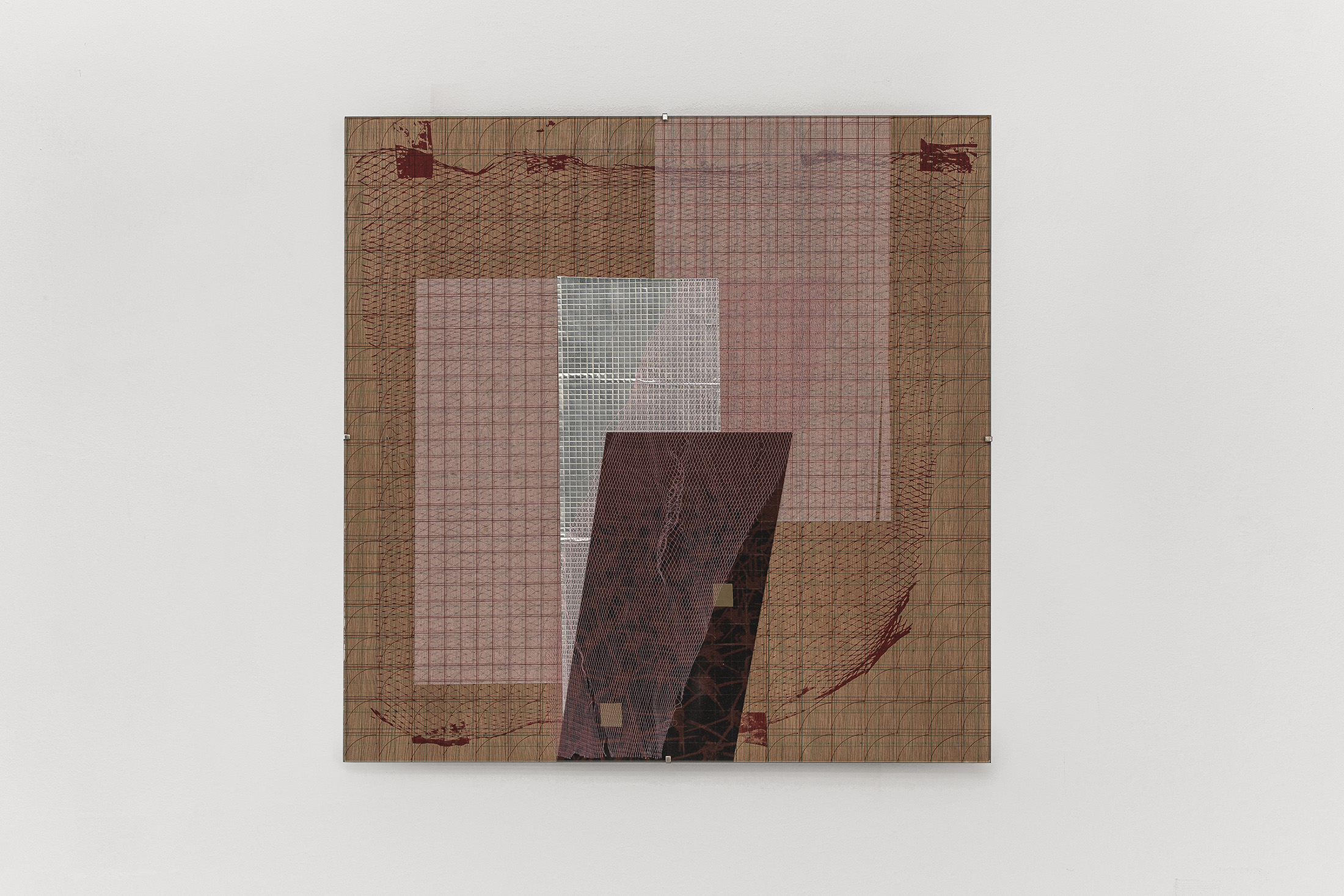 ![]() 《装饰物(现代织网)》,2023年,铝箔、UV打印、编辑框架、木板、彩铅、砂纸、尼龙网、丝网印刷、彩色雪梨纸、胶带,40 × 40 厘米。摄影:章丛欣
