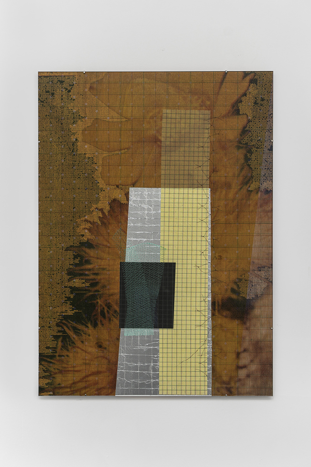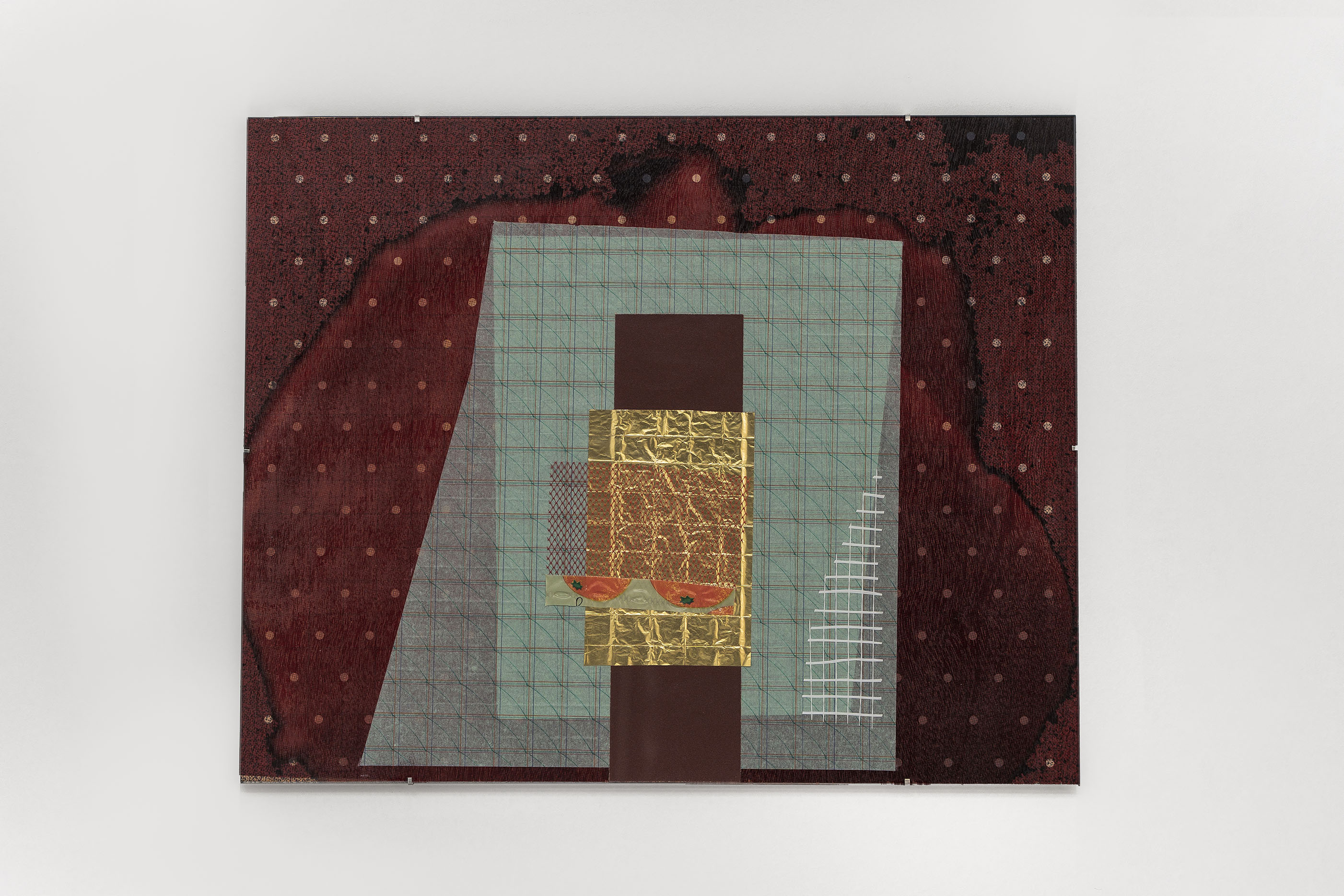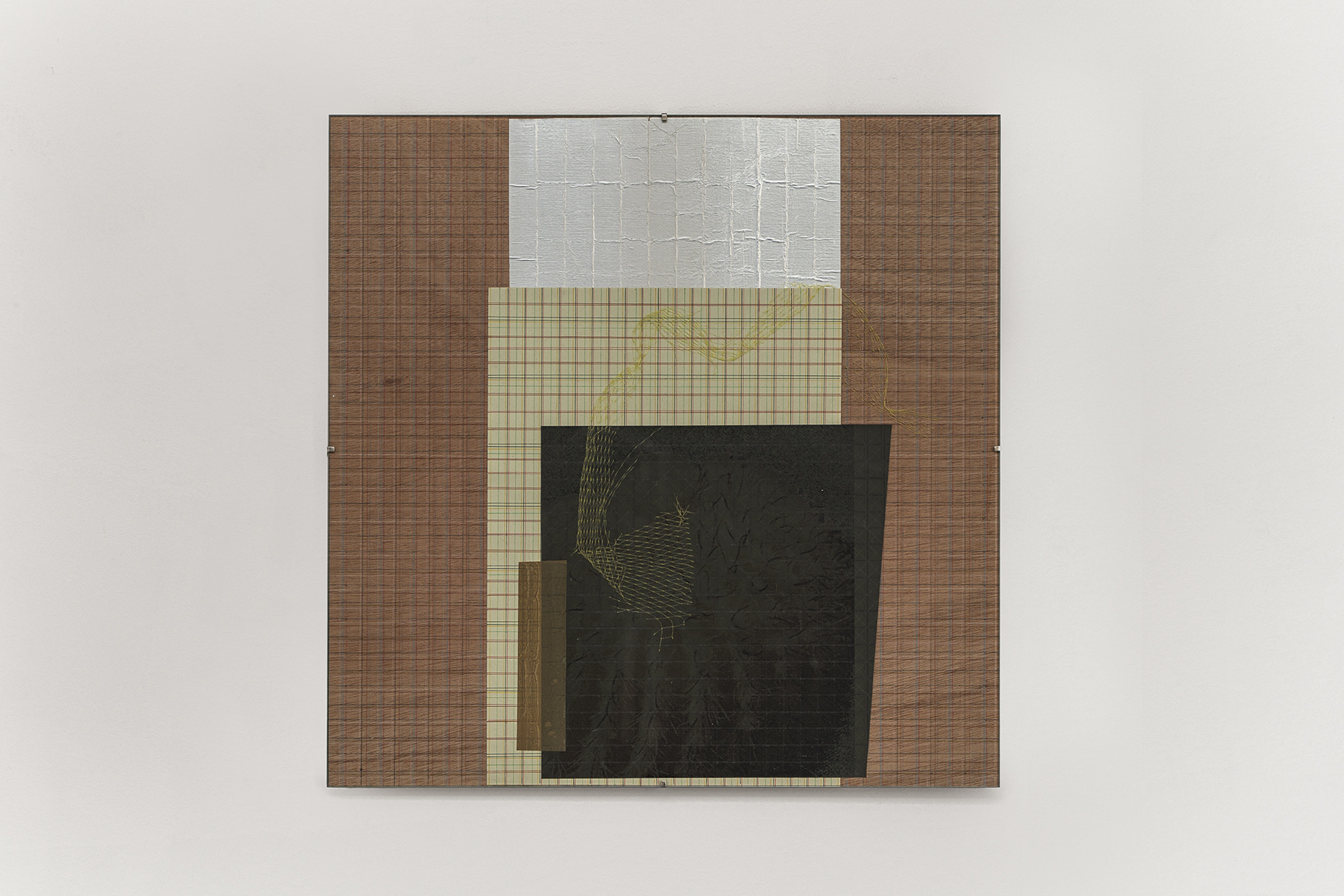 ![]() 《装饰物(叠加练习)》,2023年,铝箔、UV打印、编辑框架、木板、彩铅、砂纸、尼龙网、丝网印刷, 70 × 50 厘米。摄影:章丛欣