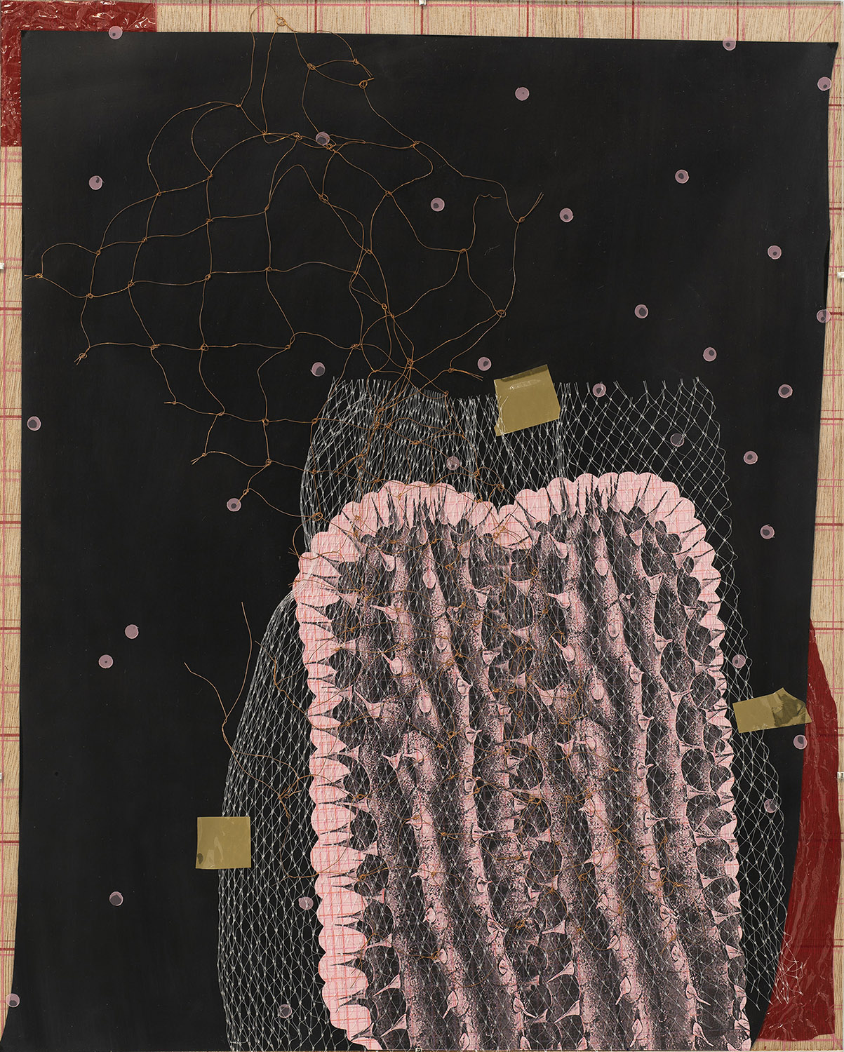"Decoration - Reflective Net" (detail), 2022, aluminium foil, UV printing, clip frame, wood panel, rubber, colored, pencil, watercolour pencil, cactus thorn, copper wire, 50 × 40 cm. Photo: Su Hang