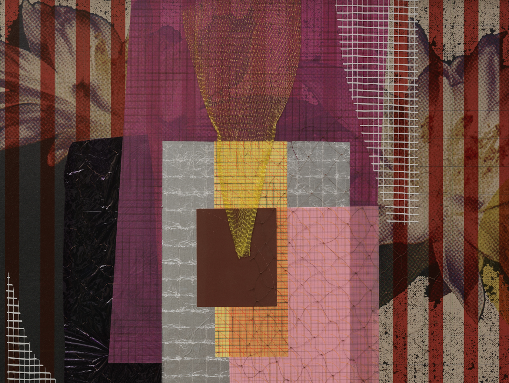 "Decoration (Moonlight Filter)"(detail), 2024, wood board, aluminum-plastic panel, UV print, silkscreen print, colored sulphate paper, sandpaper, copper wire, nylon mesh, plastic film, with teak frame and museum quality non-reflective acrylic, 61 × 91 × 4.5 cm. Commissioned by the Rockbund Art Museum. Photo: Ling Weizheng