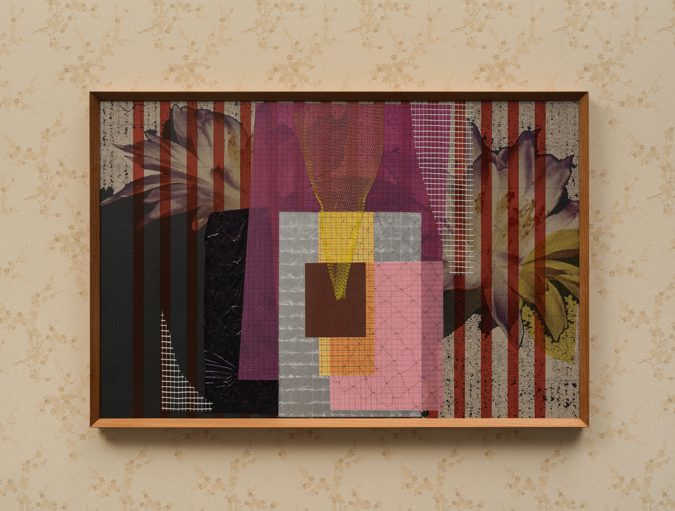 "Decoration (Moonlight Filter)", 2024, wood board, aluminum-plastic panel, UV print, silkscreen print, colored sulphate paper, sandpaper, copper wire, nylon mesh, plastic film, with teak frame and museum quality non-reflective acrylic, 61 × 91 × 4.5 cm. Commissioned by the Rockbund Art Museum. Photo: Ling Weizheng