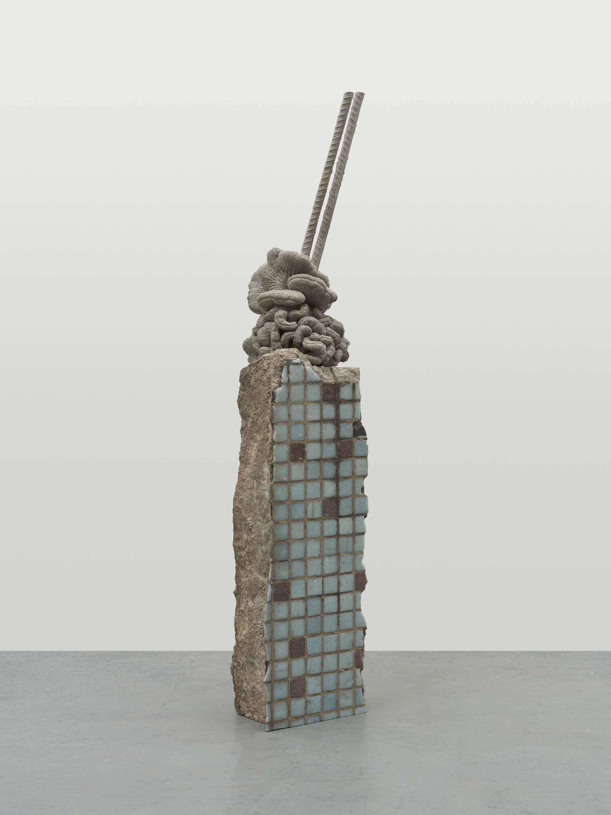"Wandering Corner" (detail), 2024-2025, wooden door, cement, construction debris, metal, screw rods, hot-rolled sheet. Wooden door 196.5 × 4.5 × 8.5 (H) cm, construction debris25 × 17 × 13 (H) cm, concrete sculpture 28 × 13 × 22 (H) cm. Photo: Ling Weizheng