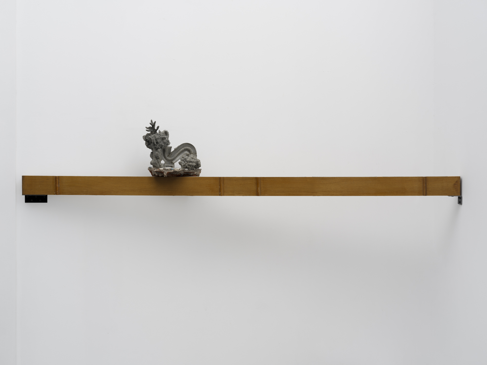 "Wandering Corner", 2024-2025, wooden door, cement, construction debris, metal, screw rods, hot-rolled sheet. Wooden door 196.5 × 4.5 × 8.5 (H) cm, construction debris25 × 17 × 13 (H) cm, concrete sculpture 28 × 13 × 22 (H) cm. Photo: Ling Weizheng